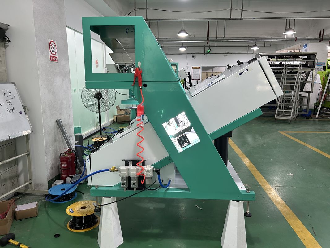 Die Rohstoffe werden in die Maschine aus dem Materialhocker auf der Oberseite eingelegt.Vibrationen durch Vibrationszufuhr und Schieben entlang der Materialrutsche in die Beobachtungszone in der Sortierkammer durch Sensoren und HintergrundplatteUnter dem Einfluss der Lampenquelle empfängt der CCD-Sensor das zusammengesetzte Licht von den sortierten Materialien.Das System soll ein Ausgangssignal erzeugen und das Elektromagnetikventil (Ejektor) zum Laufen bringen., die Verfärbung Korn zu verwerfen Kammer und gute Materialien weiterhin in die fertige Akzeptanzkammer fallen